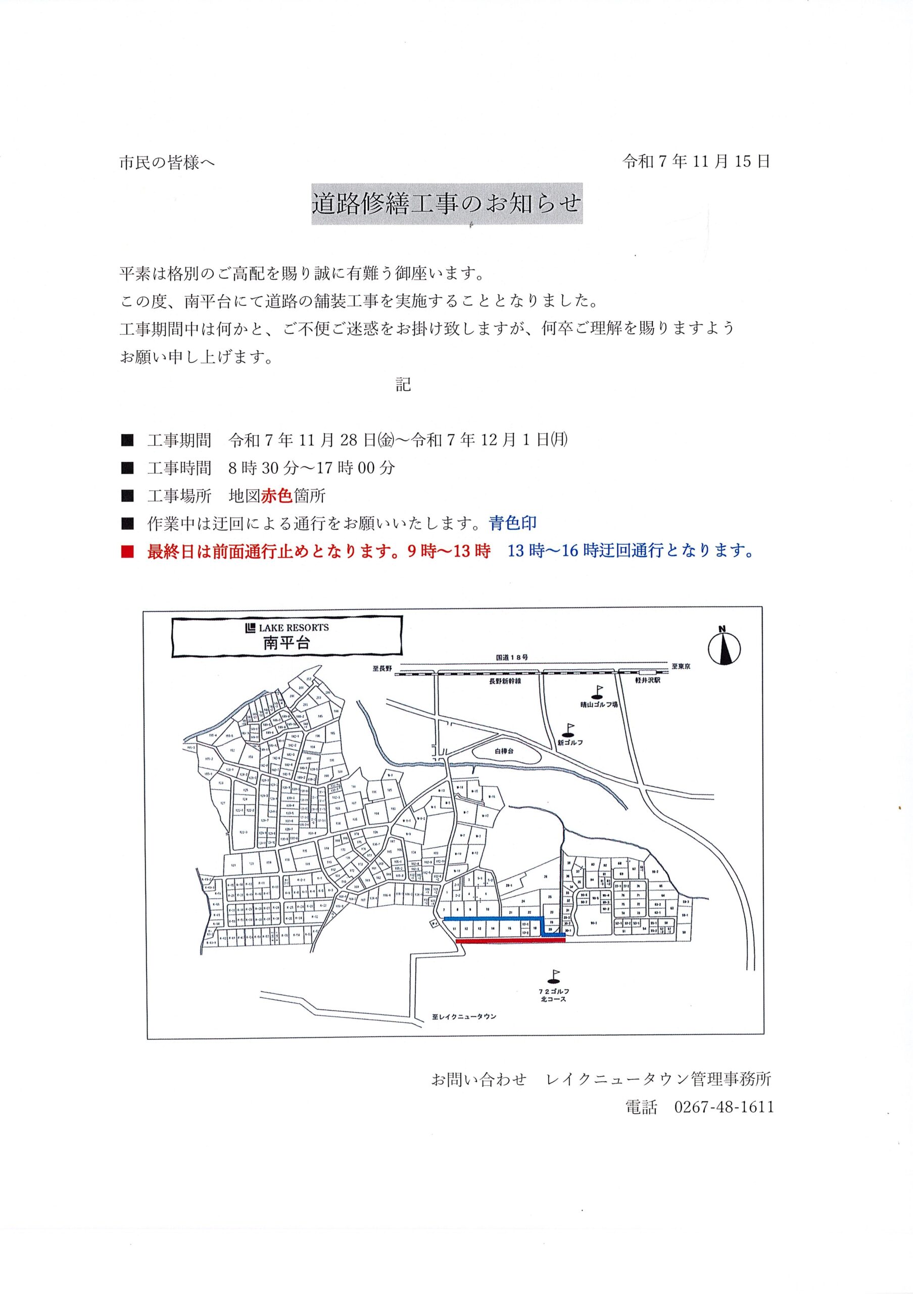 このたび、南平台にて道路の舗装工事を行うため、下記の期間中は全面通行止めとなりますので迂回路をお使いください。