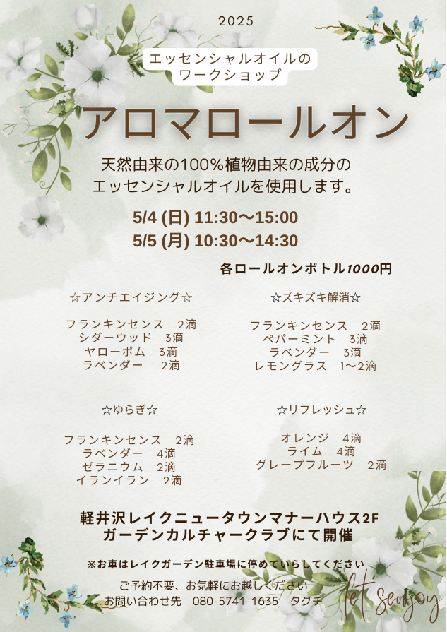 お知らせ 2025.04.24 5/4㈰・5/5㈰🌼アロマワークショップ エッセンシャルオイルのワークショップです🌱 天然由来100%植物由来成分のエッセンシャルオイルでアロマスプレーを作ります ご予約不要ですので、当日お気軽にお越しください