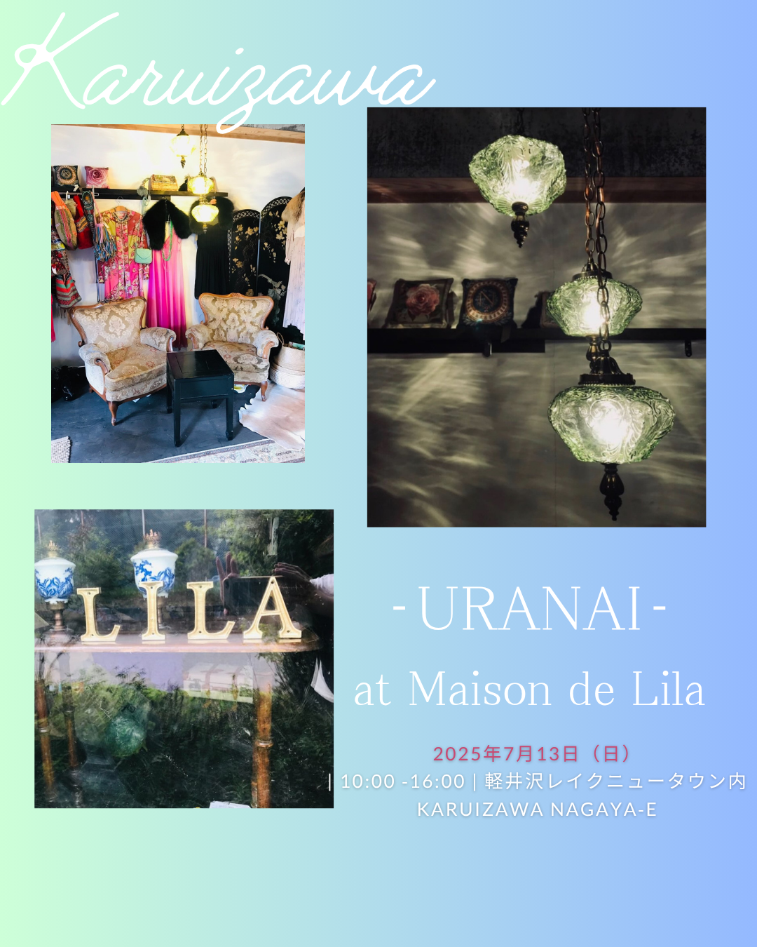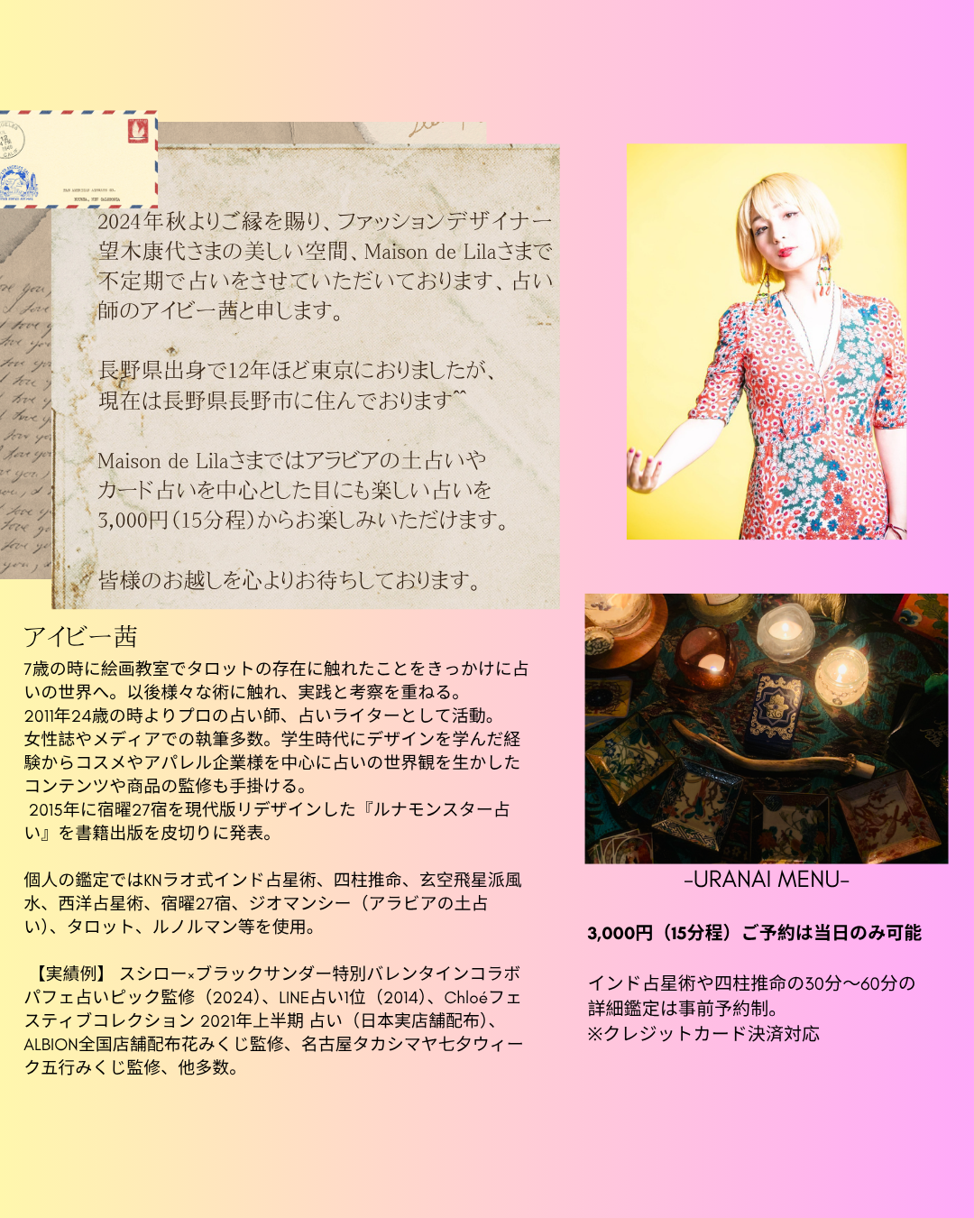 お知らせ 2025.06.29 -🕯URANAI-at Maison de Lila 7/13(日)NAGAYA-E ★アイビー茜さんによる占い★ アラビアの土占い、カード占いを中心に、神秘の世界を体験して下さい♧ ・15分の占いは当日のみ ・30分~60分の詳細鑑定は事前予約制