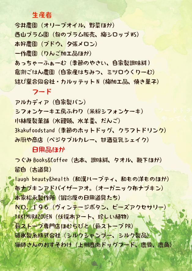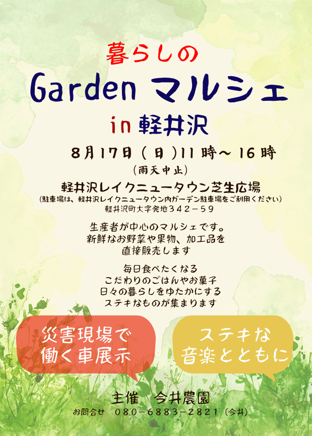 お知らせ 2025.08.15 🍃暮らしのGardenマルシェin軽井沢🍃8/17㈰ 🍃暮らしのGardenマルシェin軽井沢8/17🍃 🥬8/17㈰11時~16時 ※雨天中止 軽井沢レイクニュータウン芝生広場にて 駐車場はレイクガーデン内駐車場をご利用下さい