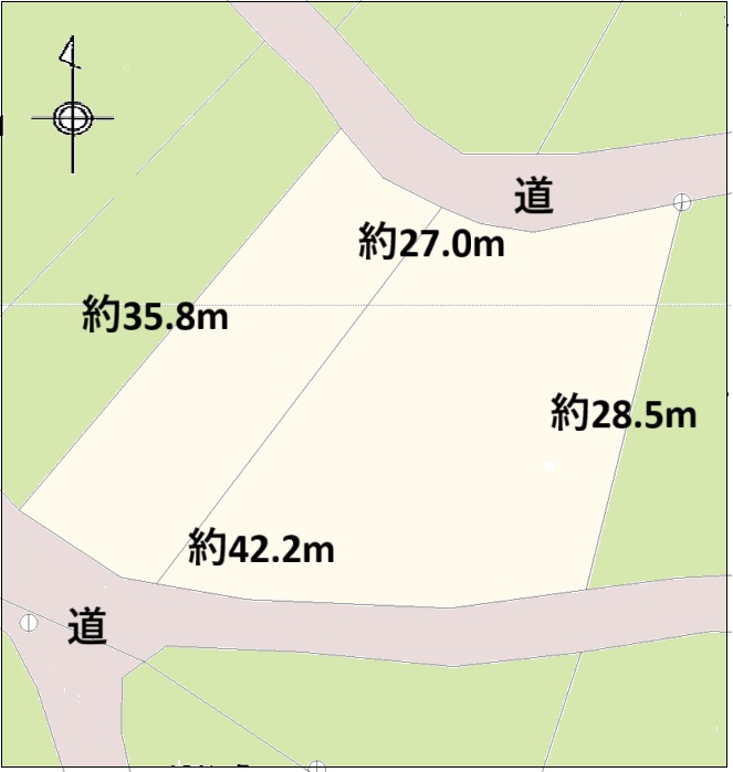 | 接道 | 北東側幅員約4.4m~5.2mの私道に約27.0m接道 南側幅員約3.6m~7.6mの私道に約42.2m接道 |